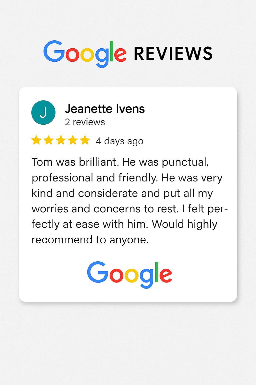 "Tom was everything you hope for in a healthcare professional: friendly, knowledgeable, professional and kind. I have no doubts on his advice and will be following it to the book. Thank you."