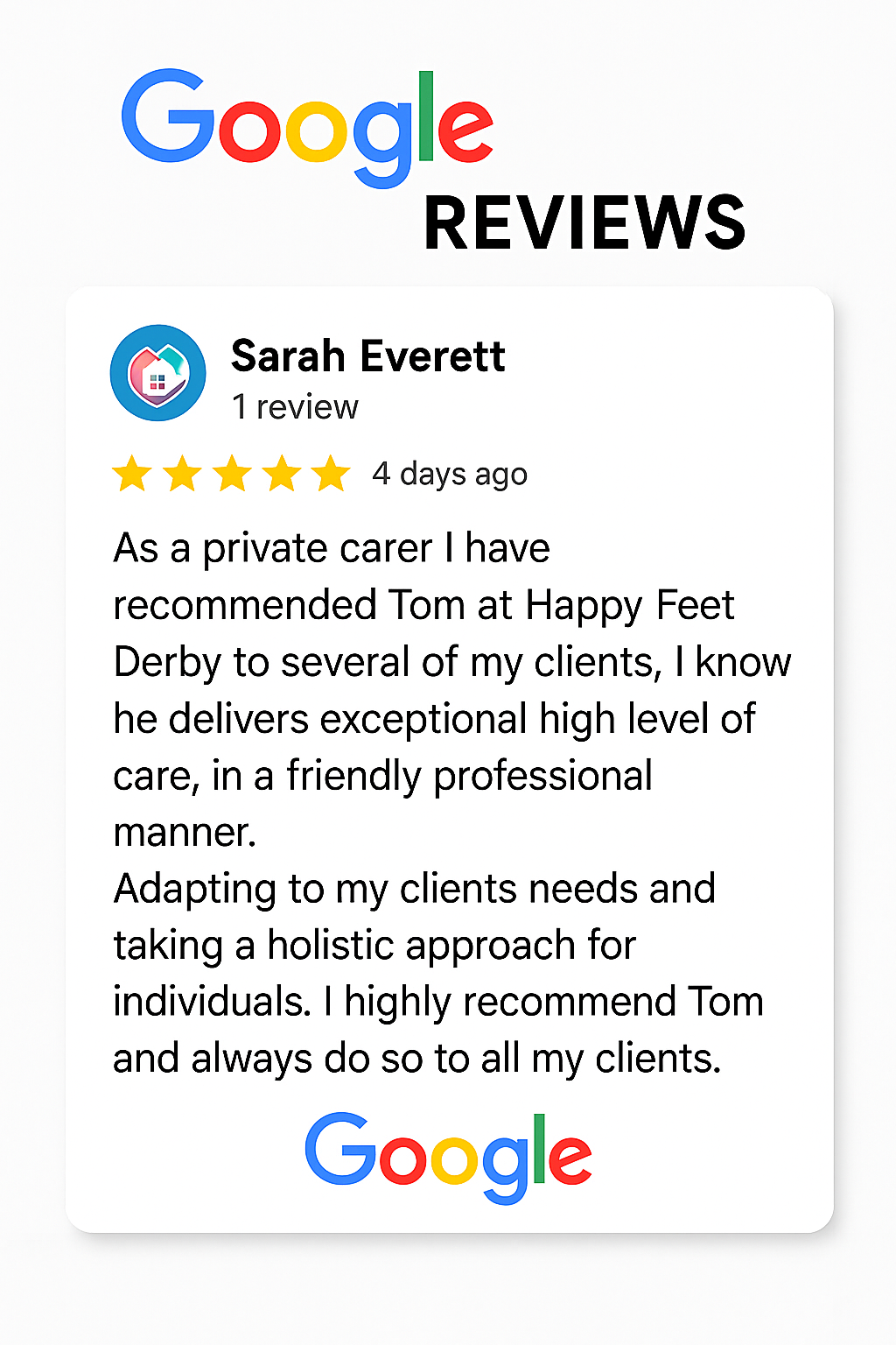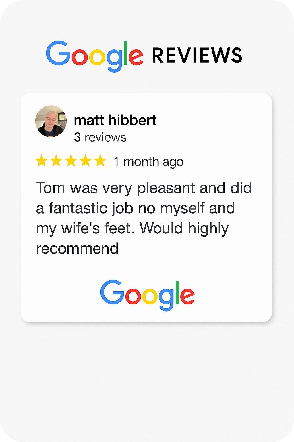 "Highly recommend Happy Feet . Tom was polite , and did a fabulous job making my very sad feet “happy” . Very thorough and full of advise and information. I shall definitely be using again. Having good feet makes such a difference. Thank you"