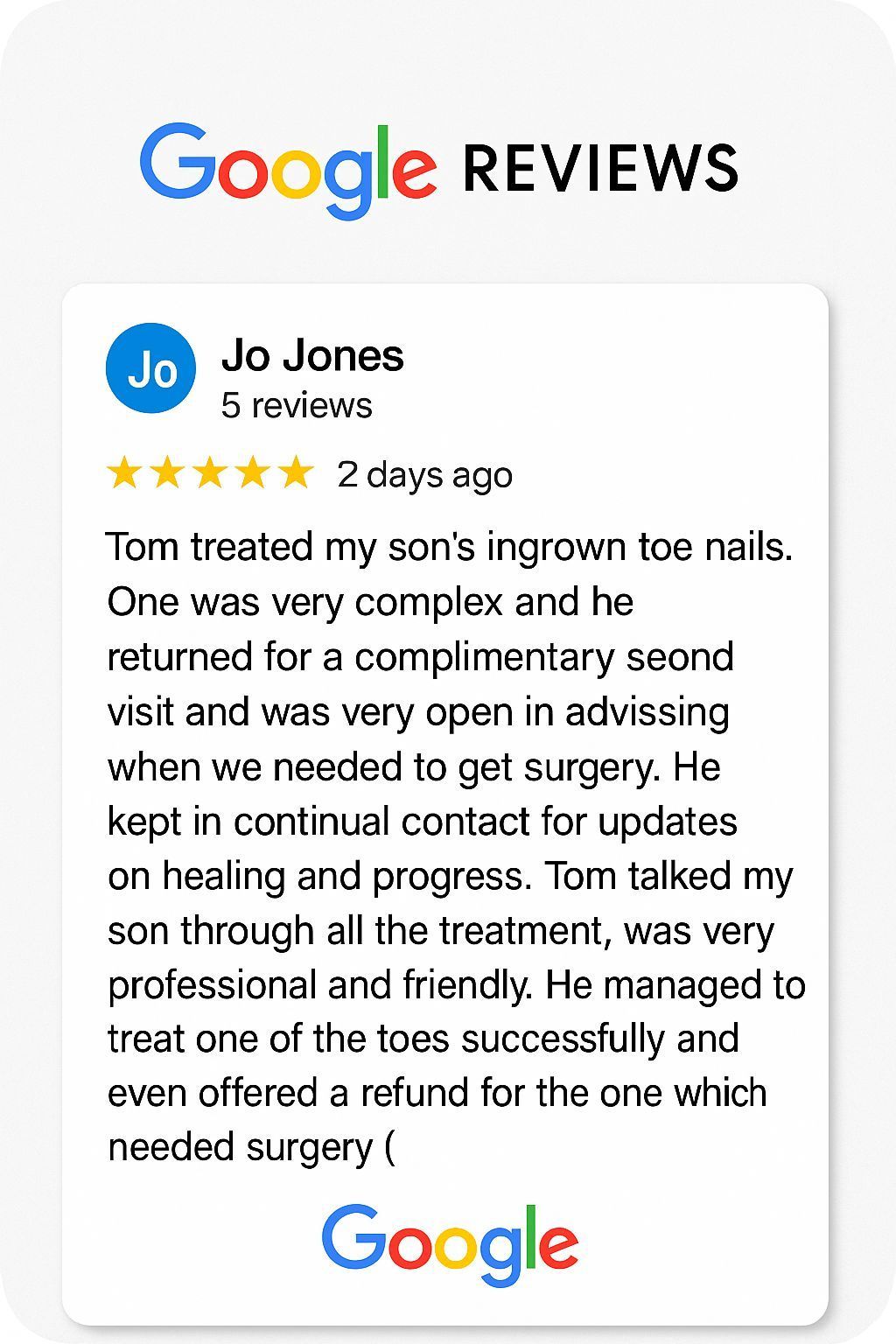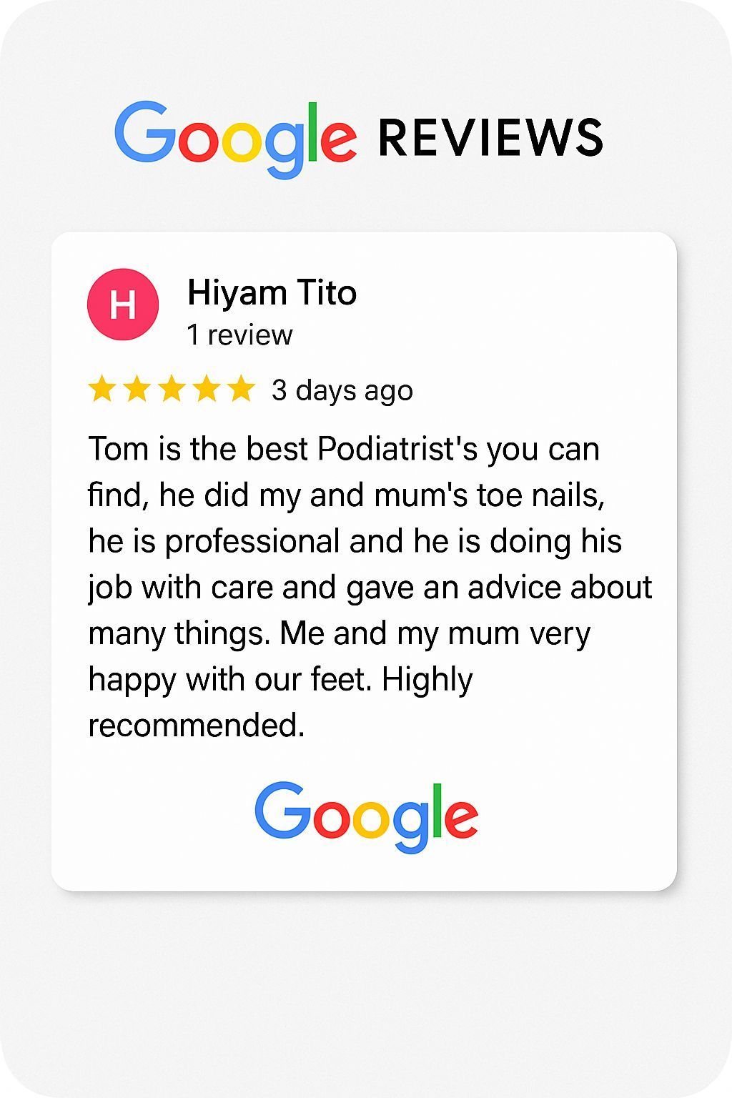 Tom was able to come and visit my elderly mum at short notice in her home to give her feet some TLC - very accommodating and respectful of her cancer diagnosis and her first ‘pedicure’ at 83